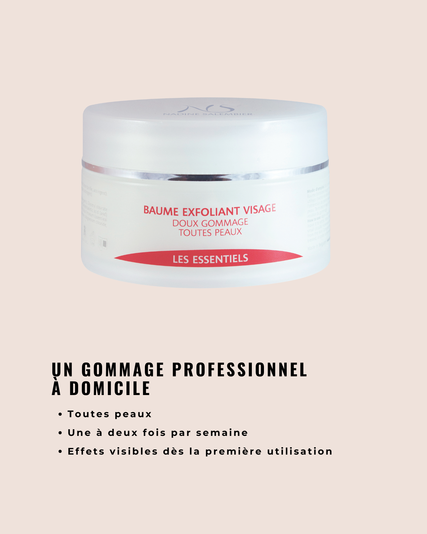 Nadine Salembier was een dynamische vrouw die het grootste deel van haar leven wijdde aan het vergroten van de schoonheid van vrouwen en mannen. Ze is perfectionistisch, vasthoudend en vastberaden en houdt zich bezig met de ontwikkeling van een compleet assortiment schoonheidsroutines, die direct zijn geïnspireerd op haar ervaring in een schoonheidssalon.